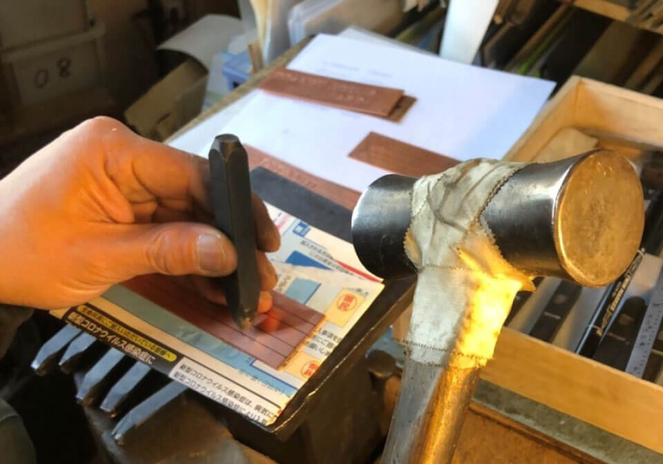 このネームプレートは弊社所属の伝統工芸士が一文字ずつ丁寧に鏨(たがね)で打ち込み製作したものになります。